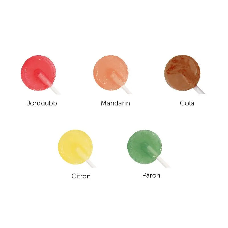 Rundklubba med mixade smaker - jordgubb, mandarin, citron, päron & cola