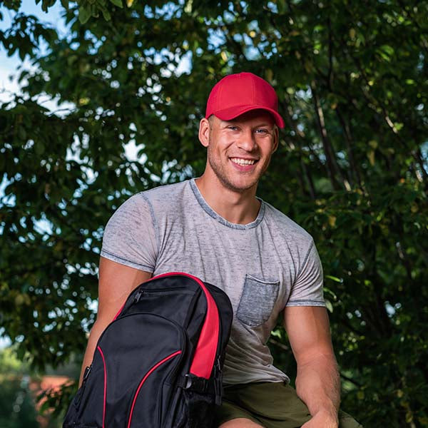 Keps i borstad bomullstwill med böjd skärm och kardborrespänne.