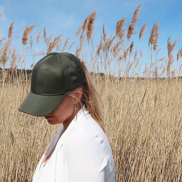 Keps i Lyocell med böjd skärm och kardborrespänne. Lyocell är ett material som tillverkas av träfibrer, en förnybar källa. Materialet Lyocell är hållbart, mjukt och andas bra.