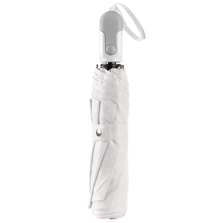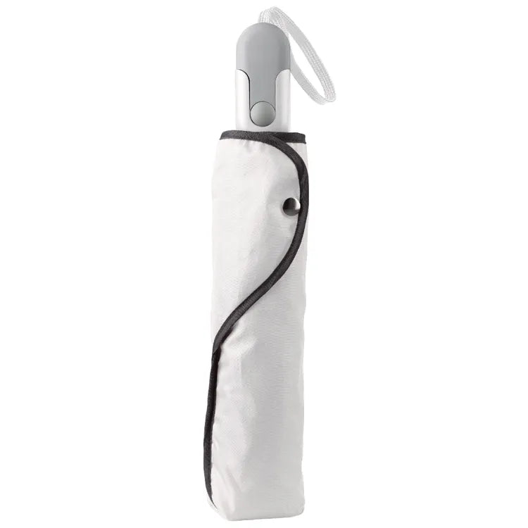 Vackert hopfällbart paraply med sleeve och ergonomiskt designhandtag. Ramen är gjord av glasfiber för extra hållbarhet. Den svarta ramen ger en fin kontrast till det vita taket.